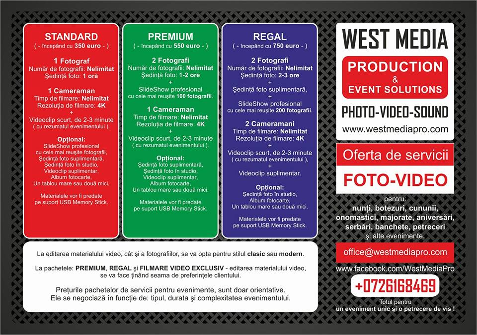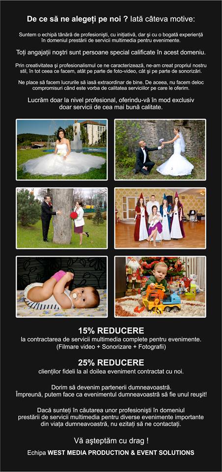 West Media Production & Event Solutions va ofera urmatoarea gama de servicii: